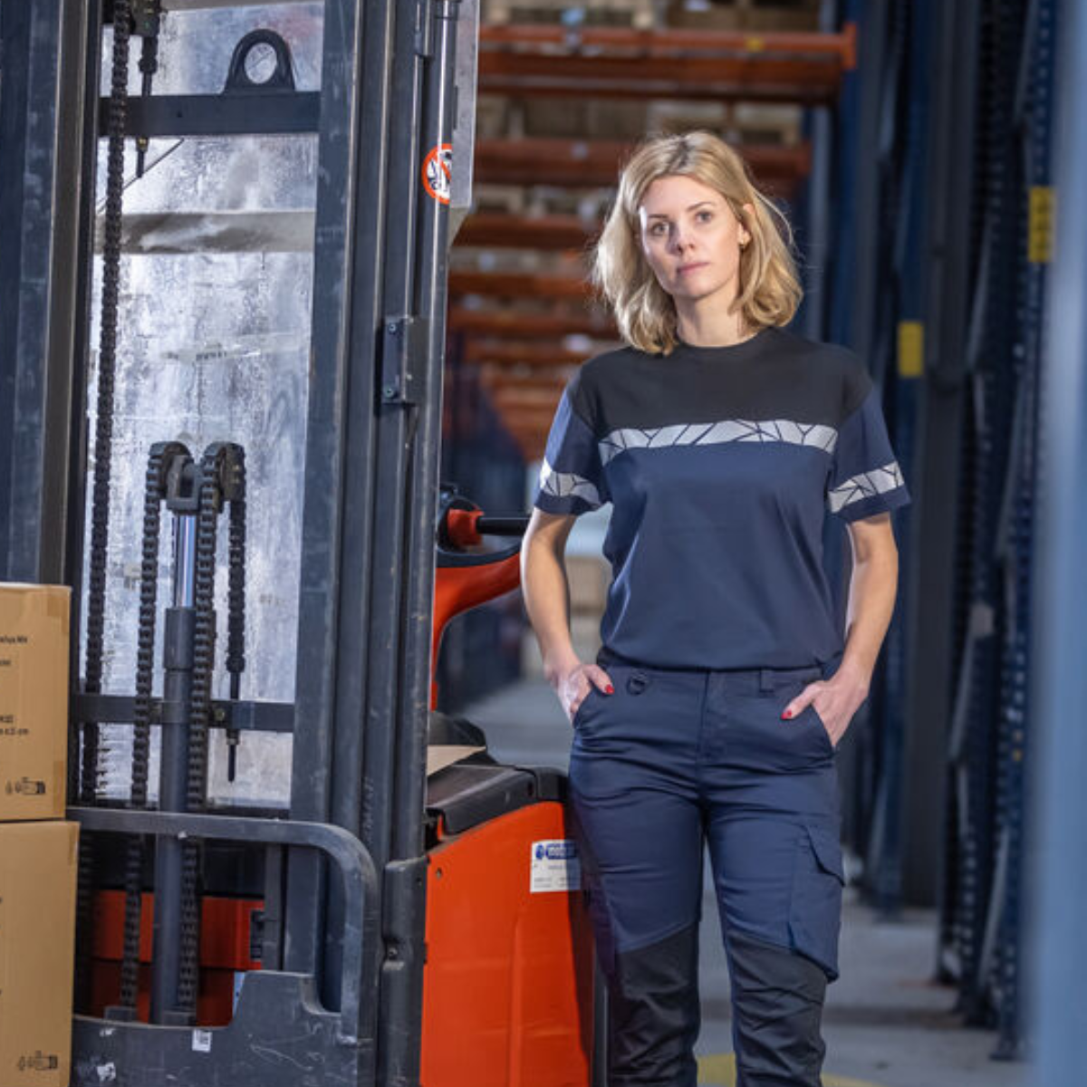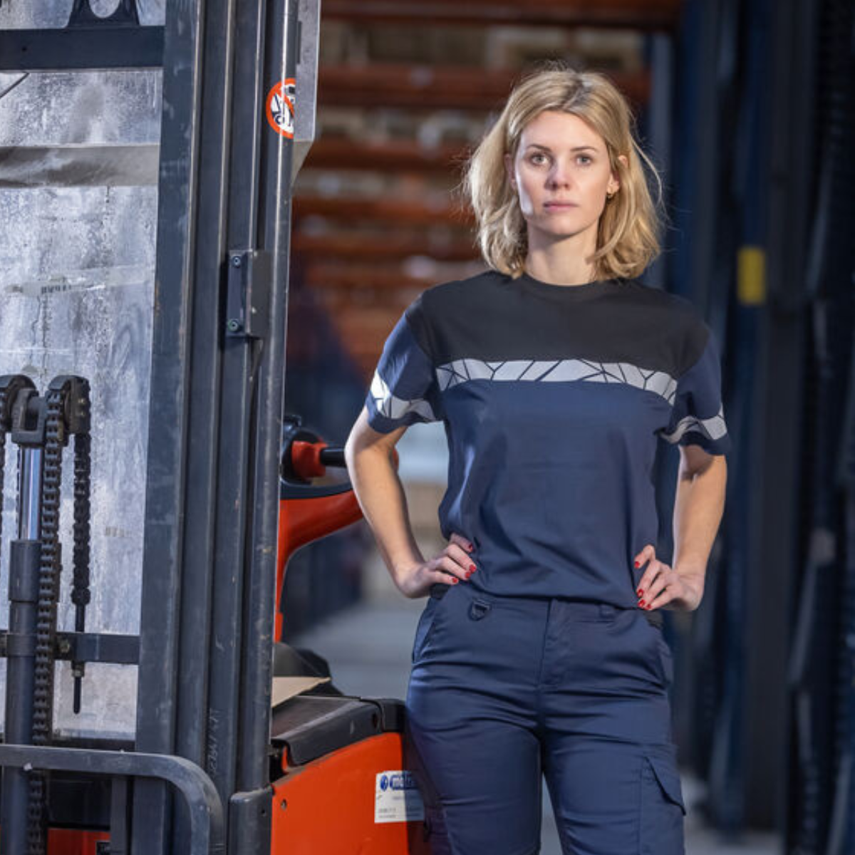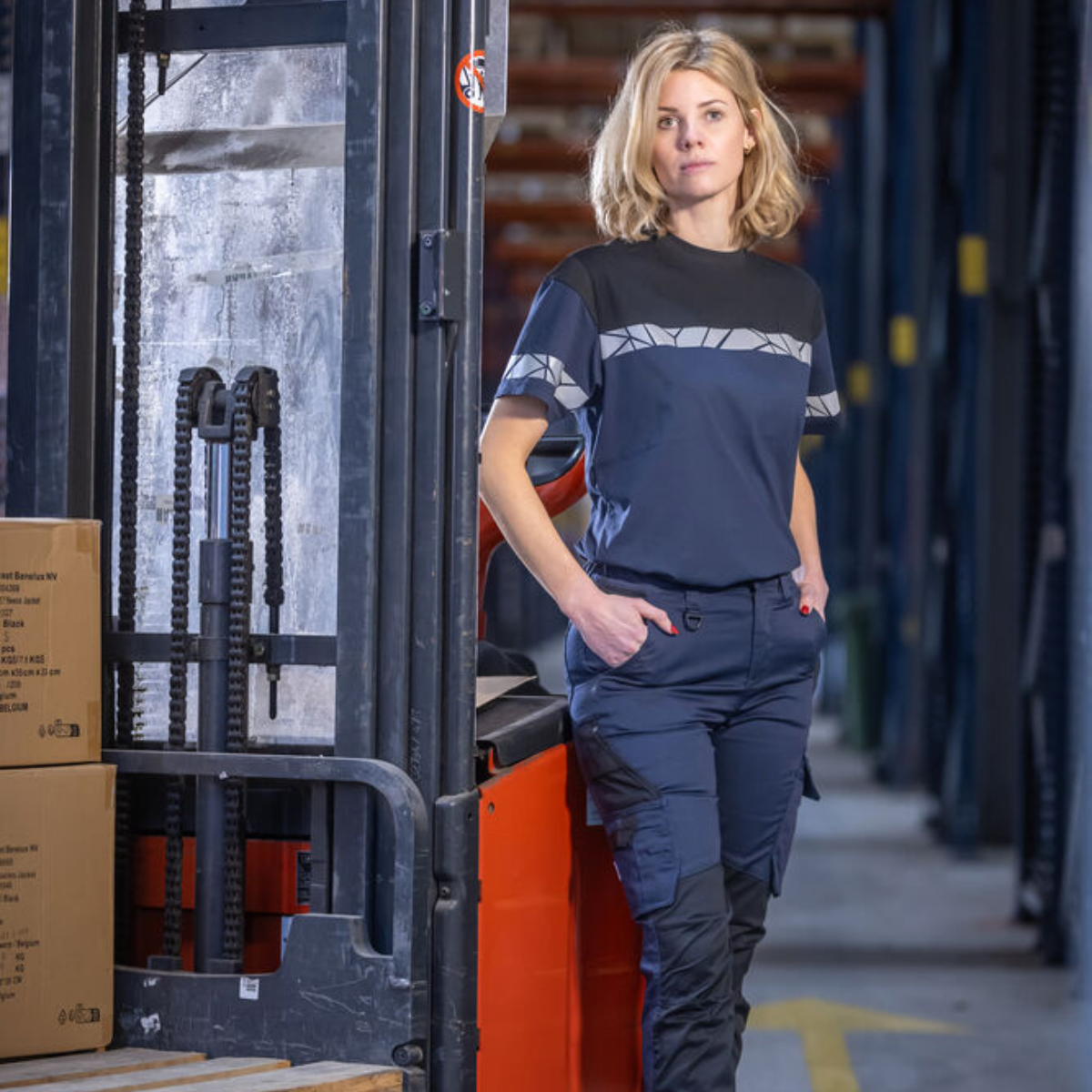 ProJob T-shirt Dame – moderne og komfortabel arbeids-T-skjorte med fire-lags halsmansjett og lomme for vaskebrikker. Kan leveres med logo. Sertifiseringer: ISO 15797 industrivask, EN 17353 økt synlighet, Øko-Tex 100.