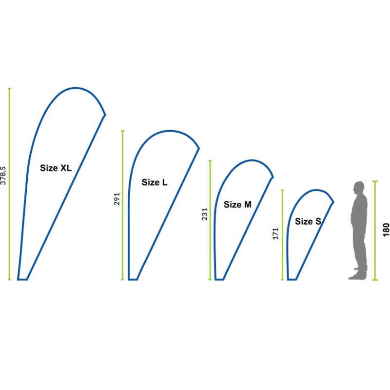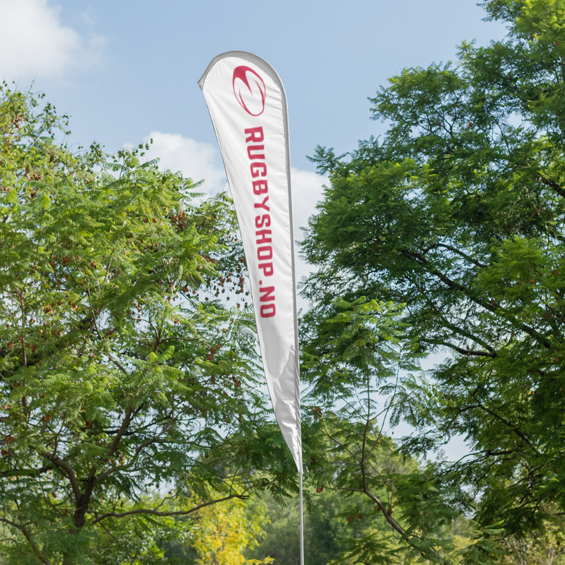 Tradisjonelt F-formet beachflagg med B1-sertifisert flaggduk og fleksibel mast i aluminium og glassfiber. Vær obs på at vi alltid selger flagg og flaggstang separat, for komplett beachflagg må flaggstang derfor legges til i bestillingen. Vi har valgt å gjøre det på denne måten slik du så enkelt og rimelig som mulg skal kunne bytte budskap på flagget eller erstatte en ødelagt stang uten å være nødt til å bestille begge deler. Det er bra for både budsjettet og miljøet.
