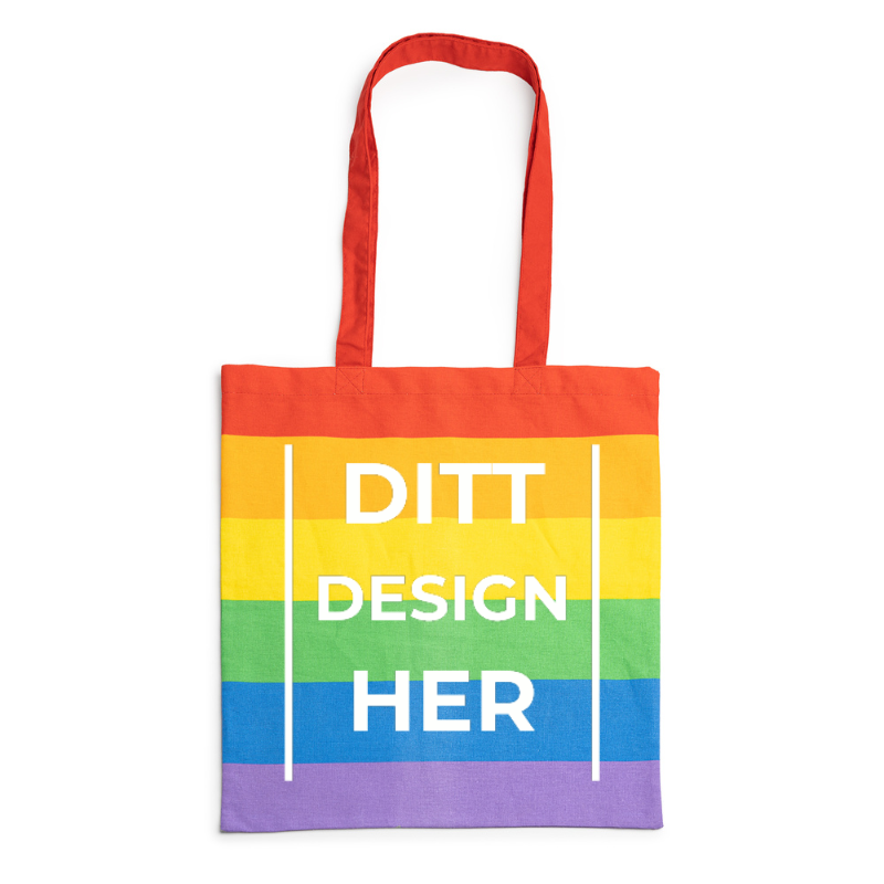 Pride Rainbow handlenett er et sold, regnbuefarget handlenett produsert av 100 % bomull (180 g/m²) med forsterkede hanker på 70 cm. Perfekt for Pride events og -markeringer, som Pride merch og all slags hverdagsbruk. Egnet for trykk med DTF, transfer, silketrykk og brodering.