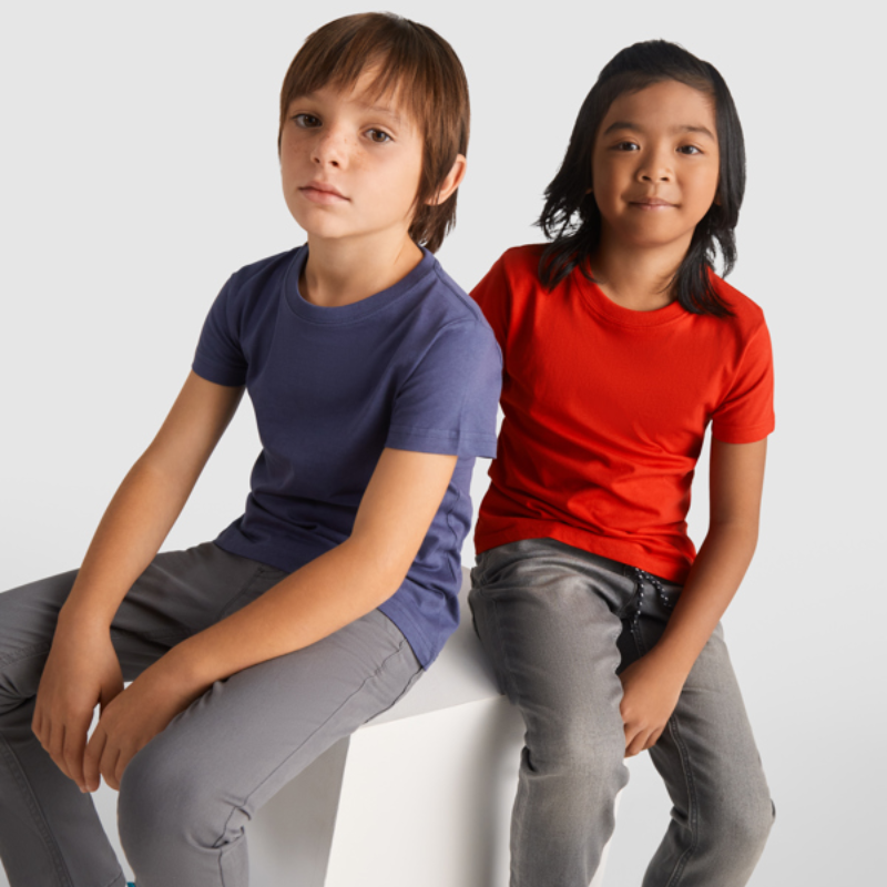 180 gsm 100% single jersey, kjemmet bomull, Oeko-Tex Standard 100. 4-lags rund hals med forsterkede sømmer i krage og skuldre.