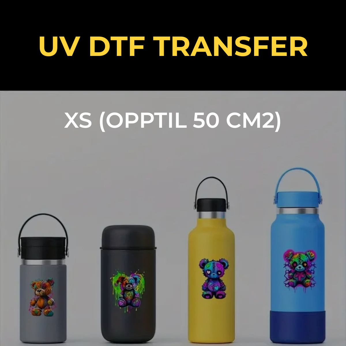 UV DTF kan bestilles i størrelser opptil 500 cm2 (maksimal printbredde 56 cm). Denne størrelsen er for merker opptil 50 cm2.